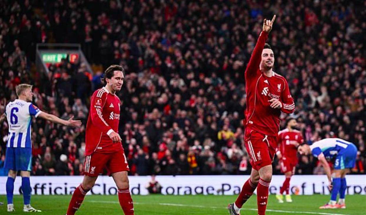 而在英格兰的安菲尔德球场,利物浦与布莱顿的足总杯第四轮较量同样引人关注。 第42分钟,科尔克兹在左路送出传中,客串右后卫的琼斯门前包抄推射破门,为利物浦打破僵局1-0领先。 第56分钟,萨拉赫在右路接到长传转移后不停球直接横传,索博斯洛伊插上爆射破门,将比分扩大为2-0。