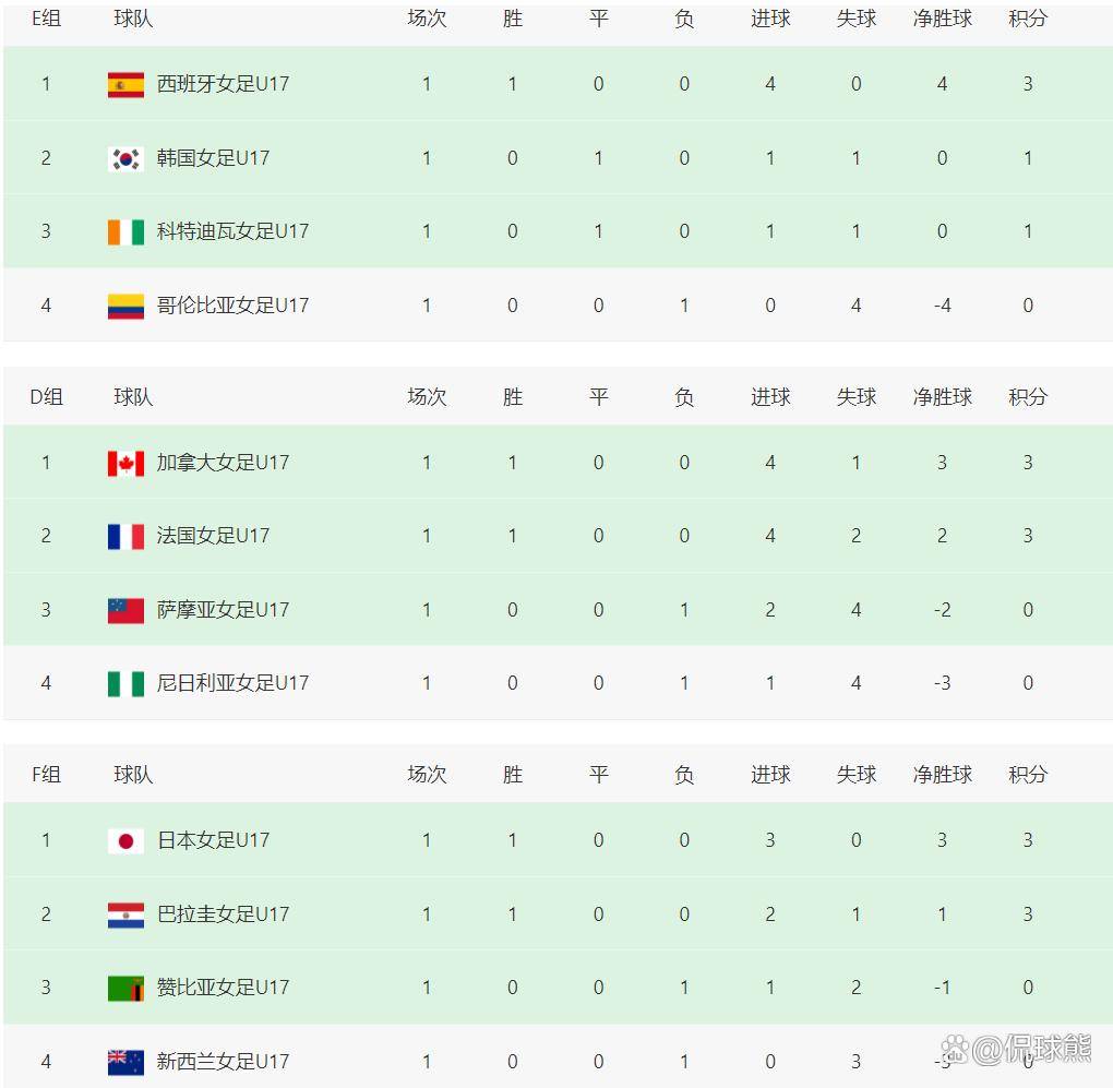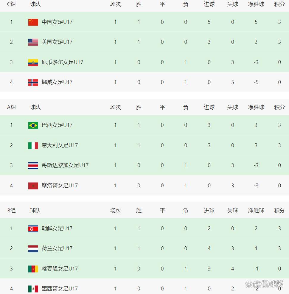 目前,U17女足世界杯首轮比赛已经全部结束。从积分榜上来看,中国女足、日本队和朝鲜队三支亚洲球队均位居各自小组的榜首,展现了强大的竞争力,而韩国队也暂时位居小组第二。在欧洲球队中,只有西班牙队排名小组第一。