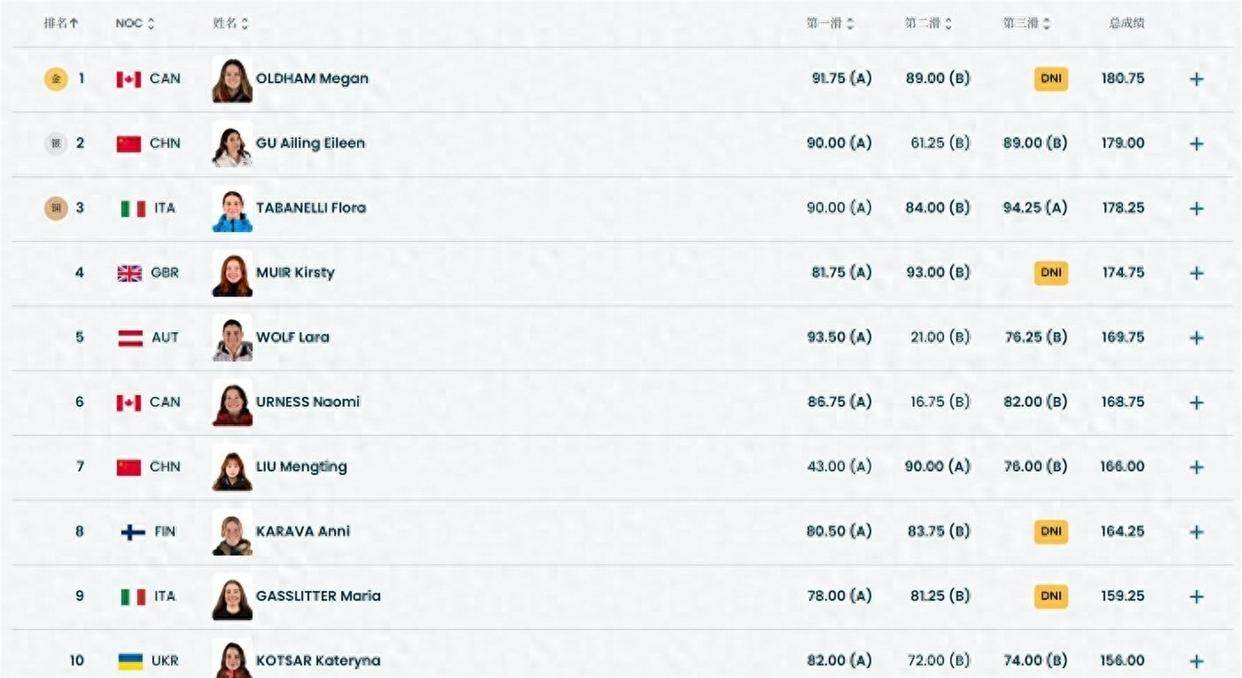 后续出场的选手中,意大利选手塔巴内利在第三轮完成了左转1620度的高难度动作,拿到单跳最高的94.25分。 但她的B类动作只有84分,最终总分178.25分。 其他选手的分数都没有超过179分。